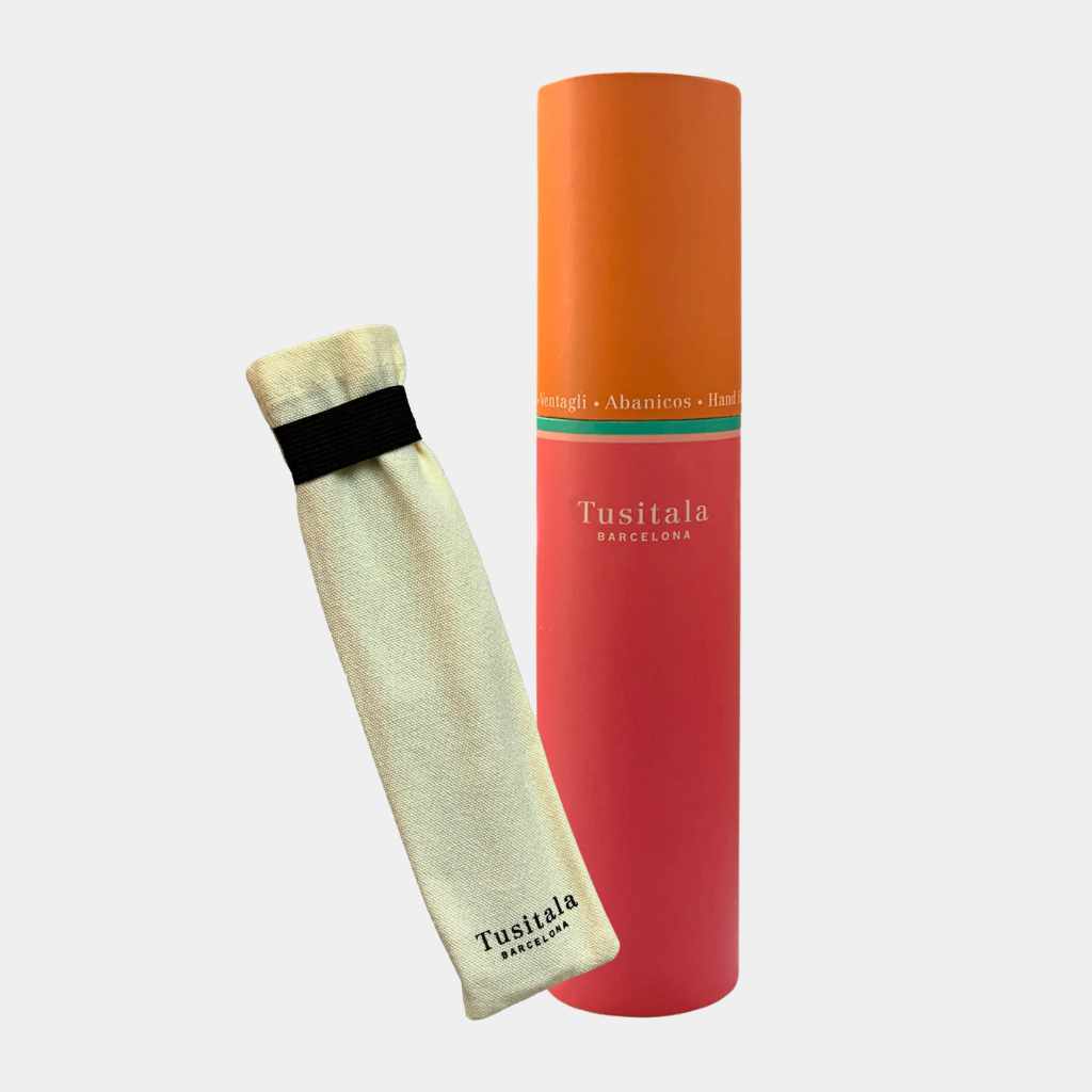 Abanico con diseño en estampado floral. Pieza montada de forma artesanal sobre varillaje de madera de frutal pulido. No hace ruido al aire. Incluye una funda de algodón y viene en el interior de una elegante caja.