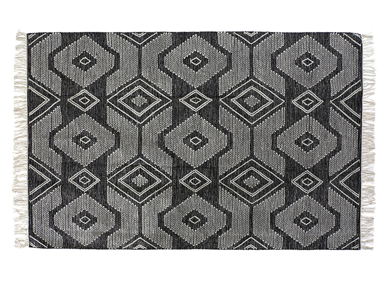 El contraste entre los tonos gris, negro y beige aporta profundidad al diseño, mientras que la textura del tejido resalta los detalles del dibujo y añade una sensación acogedora al espacio. Gracias a su estética versátil, esta alfombra se integra fácilmente en salones, dormitorios o zonas de descanso.