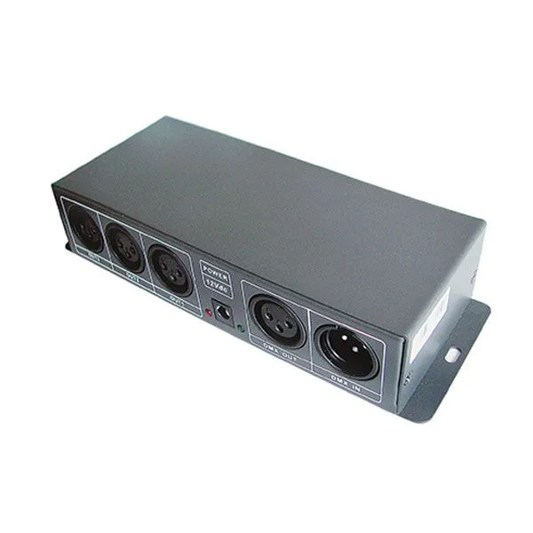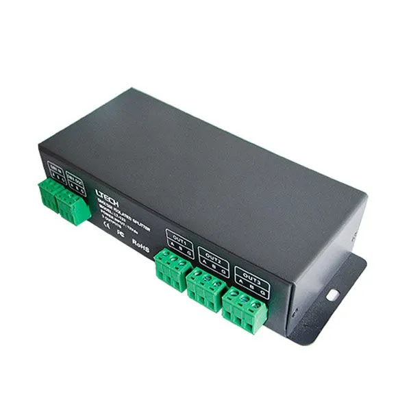 El amplificador/repetidor de señal DMX modelo LT-123 de 3 canales, está especialmente diseñado para la amplificación de la onda de señal DMX512 que se atenúa después de una transmisión de larga distancia, lo que permite extender la distancia de transmisión de la señal.