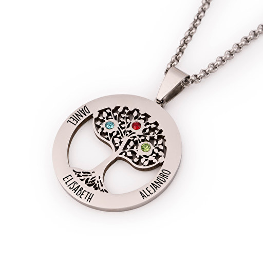 Está hecho de acero inoxidable e incluye cadena, también de este mismo material. Lo mejor es que se puede personalizar mediante grabado con tres nombres con un máximo de nueve caracteres cada uno. Cada nombre se corresponde con las tres piedras que están incrustadas en él para obtener un colgante grabado con piedras de nacimiento muy exclusivo.