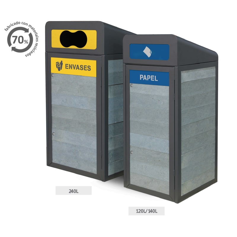Este Cubrecontenedor de reciclaje para contenedores con ruedas (mantienen totalmente ocultos los contenedores) está disponible en dos tamaños: 120L/140L y 240L. (Contenedor con ruedas interior no incluido en el precio, consultar en caso de interés).