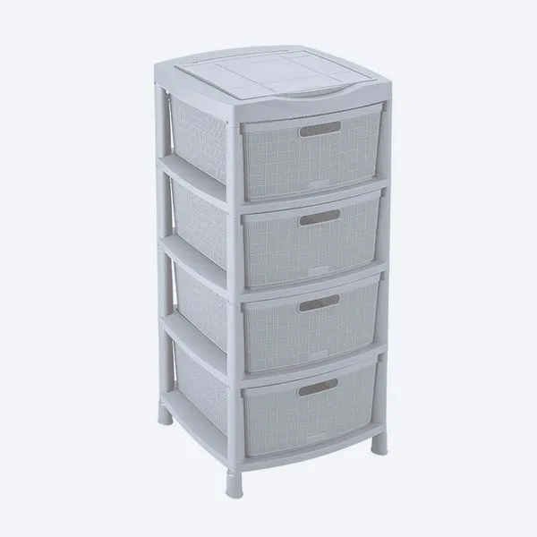 Cuenta con 4 gavetas cada una con capacidad de 30 Litros, resistencia de 25 Kg y textura artesanal que imita el tejido natural. Incluye 4 tacones y 2 rodachines que dan versatilidad en el uso.