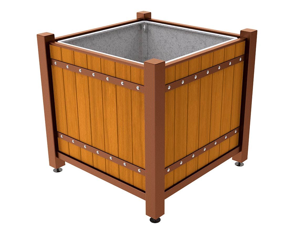 Color:Aspecto Corten|Acabado madera:Roble PEFC lacado roble claro|Longitudes:1 250 x 1 250 x 1 150 mm|Interior:Cubo poliester con asas de manutención