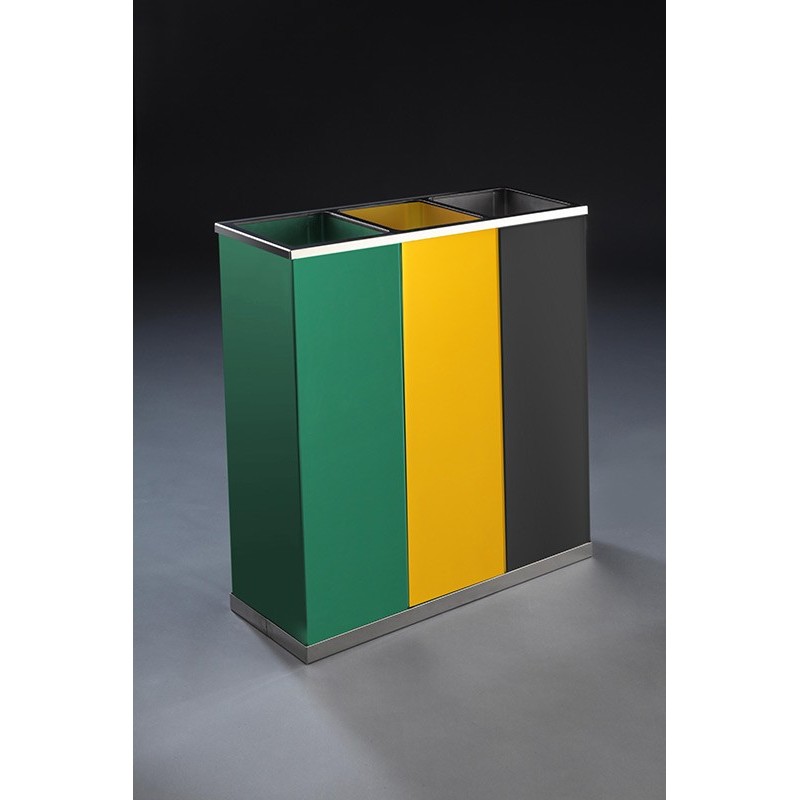 Papelera de reciclaje para la recogida selectiva de residuos con tres cubetas de 25 Litros ideales para centros educativos, oficinas y hoteles.