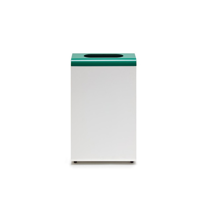Papelera fabricada en chapa de hierro de 1,2 mm. pintada a epoxi color blanco y tapas adhesivos de colores verde, amarillo, azul o marrón.