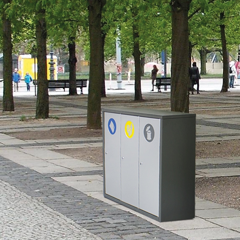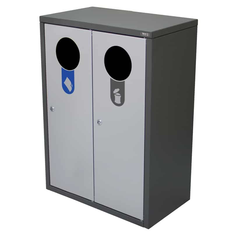 Papelera compacta y extremadamente robusta con puerta frontal.
