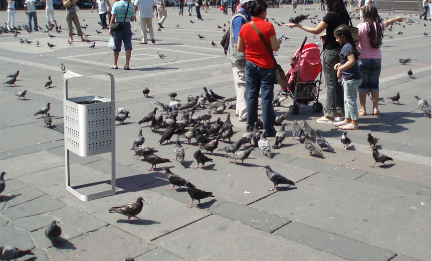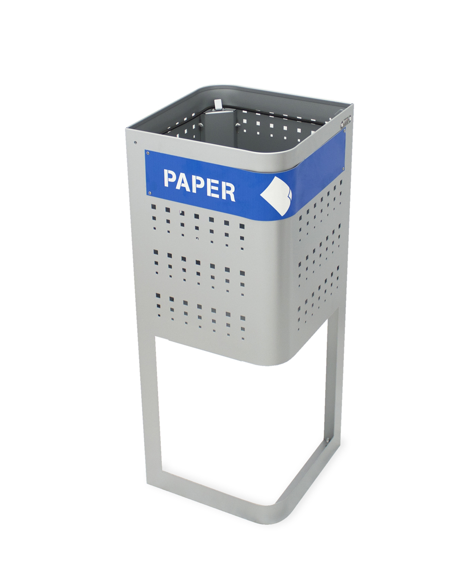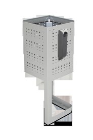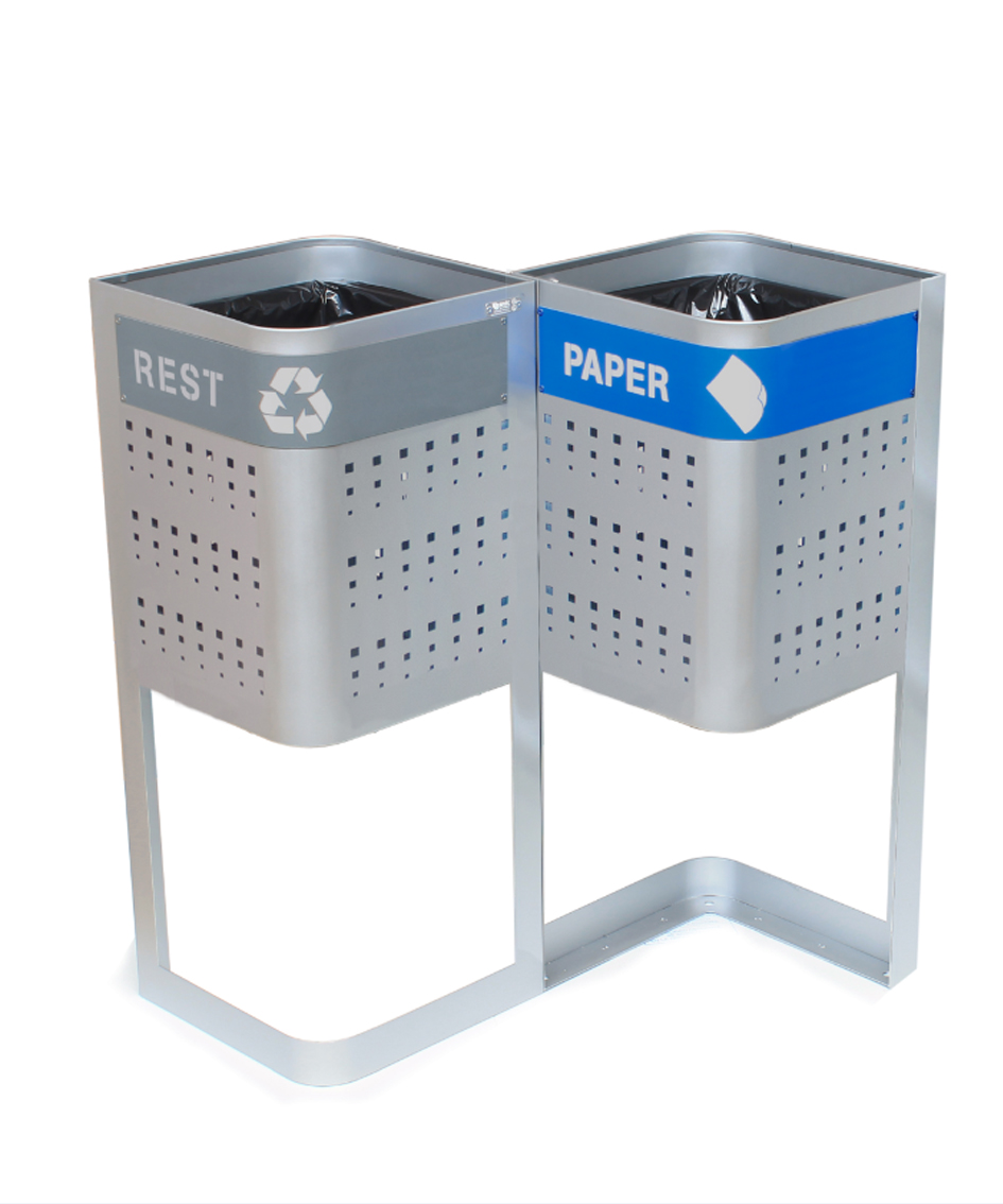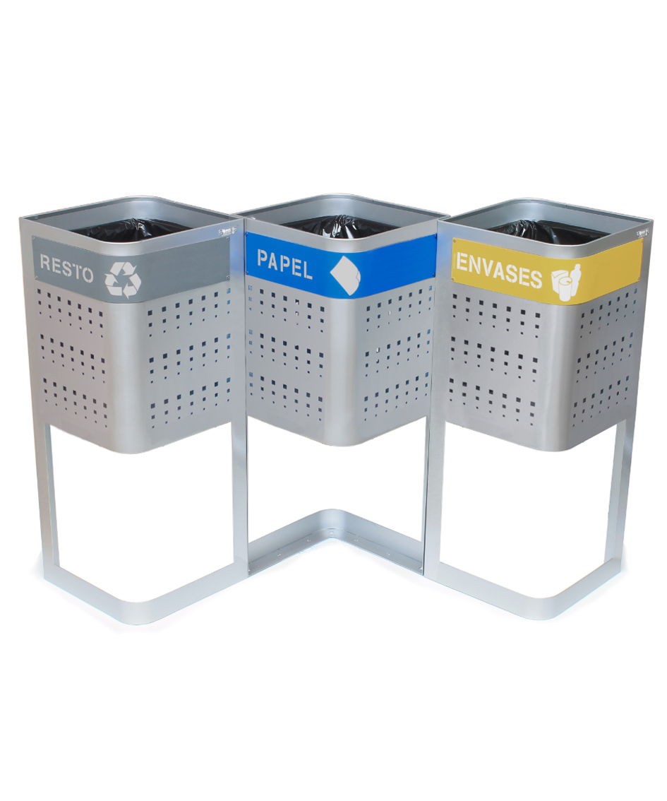 Papelera fabricada mediante planchas de acero laminado en frío y galvanizado por inmersión en caliente de 1,5 mm. Además, el acabado para esta papelera es mediante recubrimiento en polvo de resina de poliester termoendurecible, lo que la hace muy resistible a la intemperie.